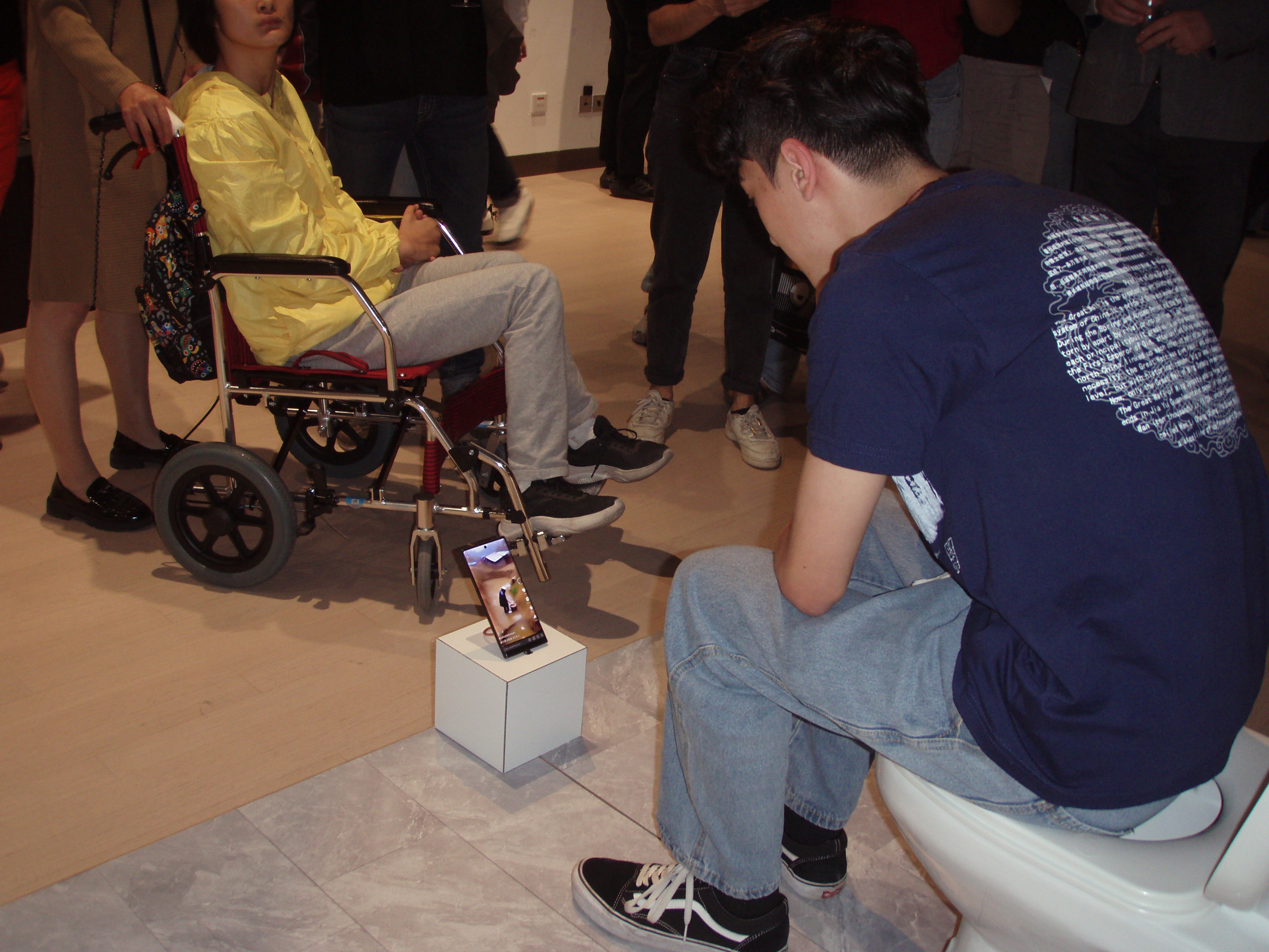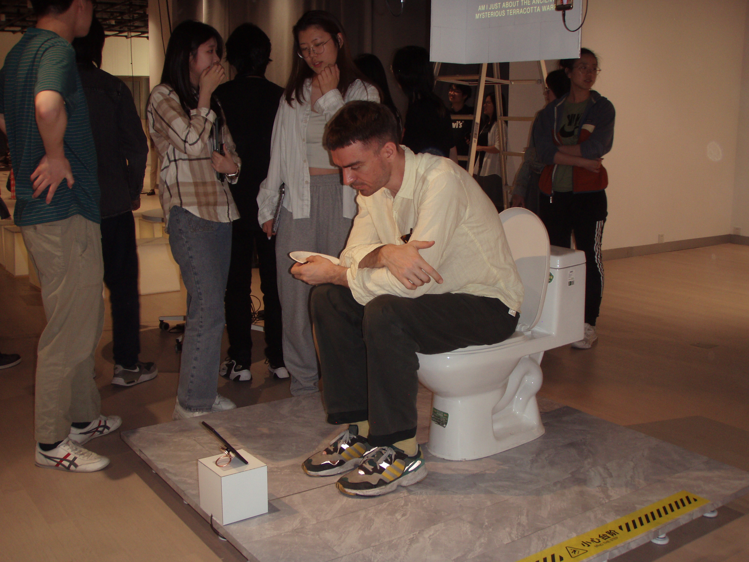 This audiovisual installation investigates Wenming (文明), which translates to ‘civilization,’ ‘civilized,’ or ‘culture,’ as the interplay between identity, ethnicity, and digital space. While Wenming is often found in street signs, propaganda, and policy in the context of constructing a civilization by economic and technological means, I highlight how social media platforms like Kuaishou, through their visual, auditory, and textual icoonography, reft a corporeal dimension of the term, acting as sites for constructing ethnic identity and cultural authenticity. My building of the public restroom, a pinnacle of Wenming in modern urban space, combines a phsyical elements y with re-imagined Kuaishou videos generated through machine learning and a soundscape of layered real Kuaishou audios. Emulating the corpeal vulnerability of using the toilet, the installation aims to show how Wenming moves though on and offline structures of power, oppression, and identity, fixang not “what” is civilized, but “who”.